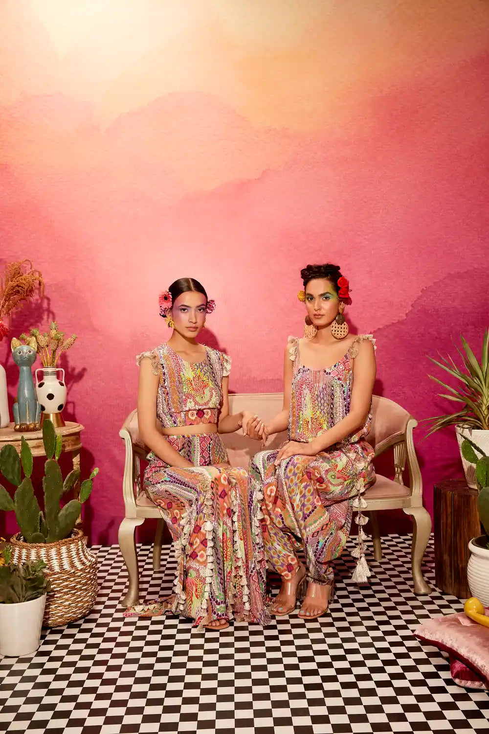 Designer Payal Singhal in her Spring-Summer ’22 collection titled ‘Folklore’ trains her focus on the otomi embroidery from Mexico mingled with kantha of Bengal, kashidakari of Kashmir and phulkari of Punjab, resulting in a poetic cross-medley of ideas and influences. “Our prints are steeped in folk history too — the two key prints include one inspired by Gond art, but with a geometric bent, and another is a unique take on a pictorial depiction of a folktale, set in the jungles of Madhya Pradesh, similar to how stories were embroidered on quilts and fabrics in the past,” says Singhal.