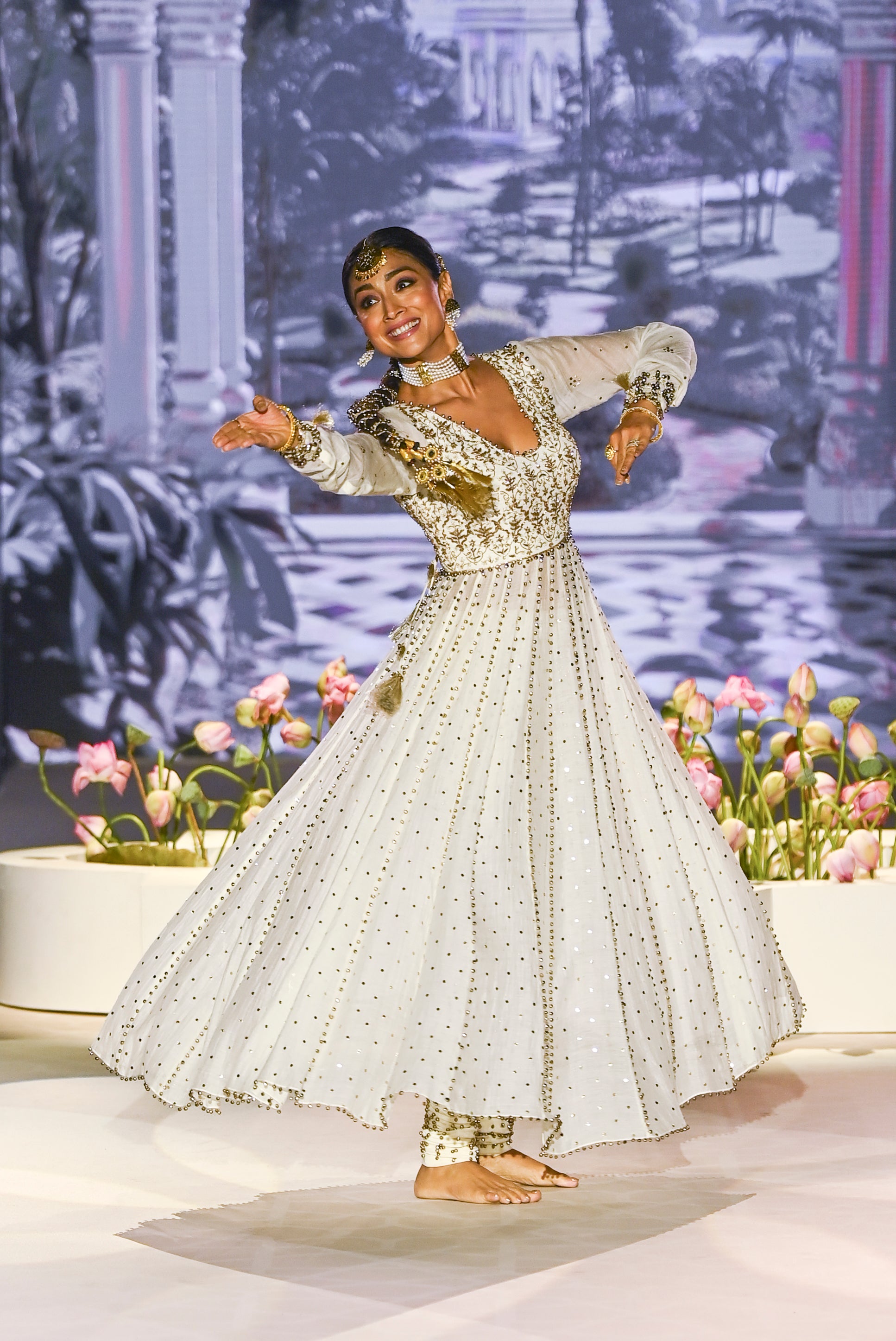 During a recent conversation, they shared how Kathak- inspired aesthetics continue to shape their designs.“My lehengas often feature asymmetrical cuts and modern silhouettes, but the embellishments—like floral vines, jaali patterns, and pastel, Mughal-inspired colour palettes—are unmistakably inspired by traditional styles,” explains Singhal. “These influences also extend to fabric choices like silk, brocade, and organza, echoing the Mughal court’s grandeur. However, I reimagine these elements in softer, more relaxed silhouettes to appeal to today’s bride and beyond.” Both designers draw inspiration from different gharanas (schools) of the dance form. Singhal’s designs channel the softness and romance of the Lucknow gharana while Balana draws from the boldness and fluidity of the Jaipur gharana.