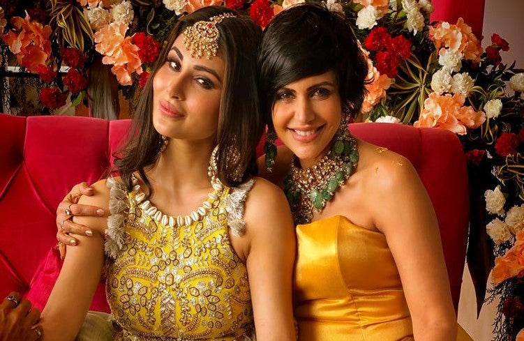 Like a ray of sunshine, for the mehendi ceremony Mouni wore a Payal Singhal ensemble featuring a yellow lehenga skirt adorned with free-flowing grey tassels. The skirt also featured minimal floral motifs. She paired the skirt with a fully embroidered sleeveless choli which featured cowrie shells around the neckline. She completed the look with a maang tika and a pair of chandbalis. Her mehendi look was styled by Rishika Devnani