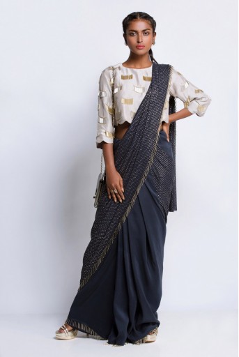 CUSTOMISE: Grey Silk Choli with Navy Silk and Mukaish Georgette Saree
