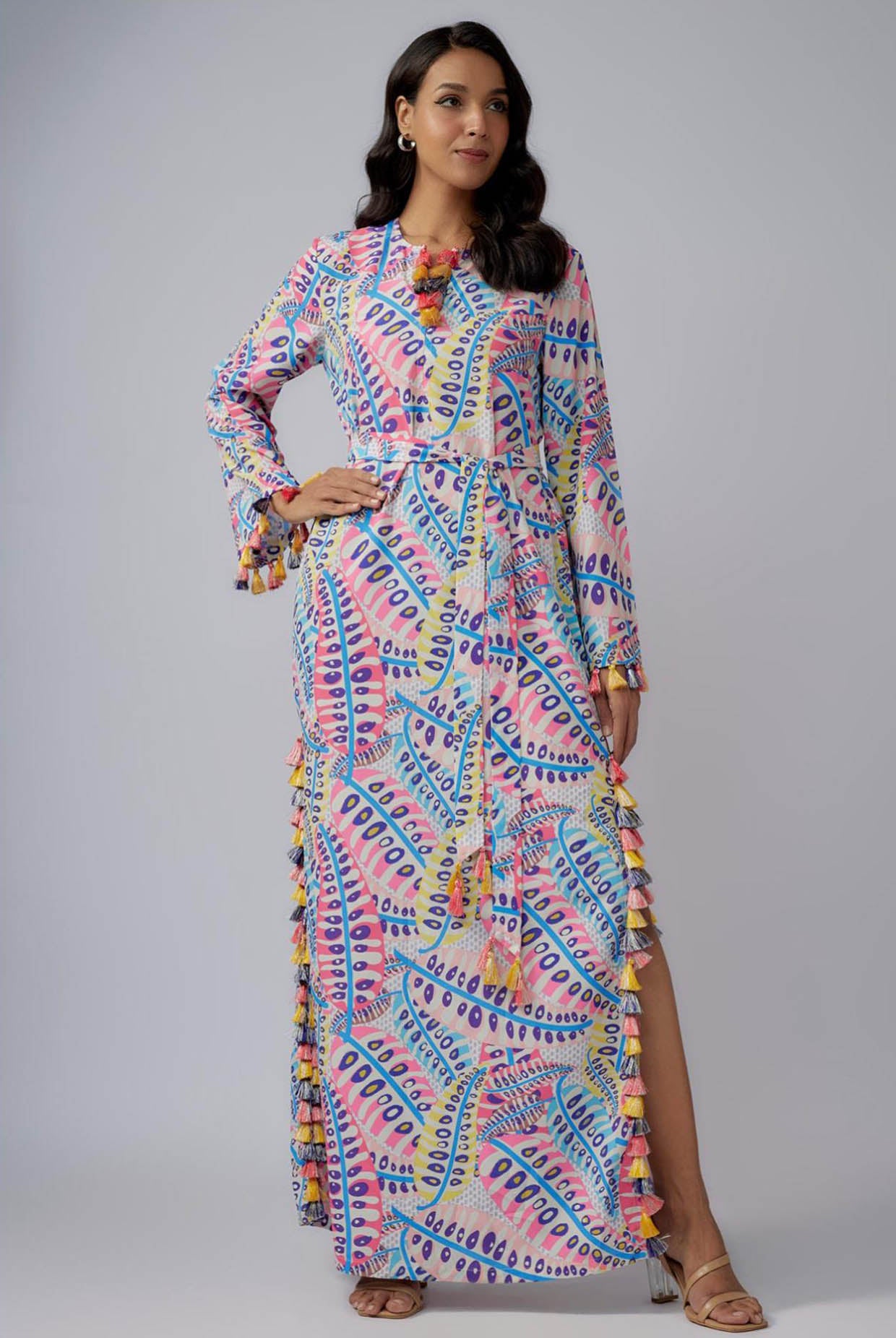 Blue poison ivy print art crepe long beyza kaftan with belt.