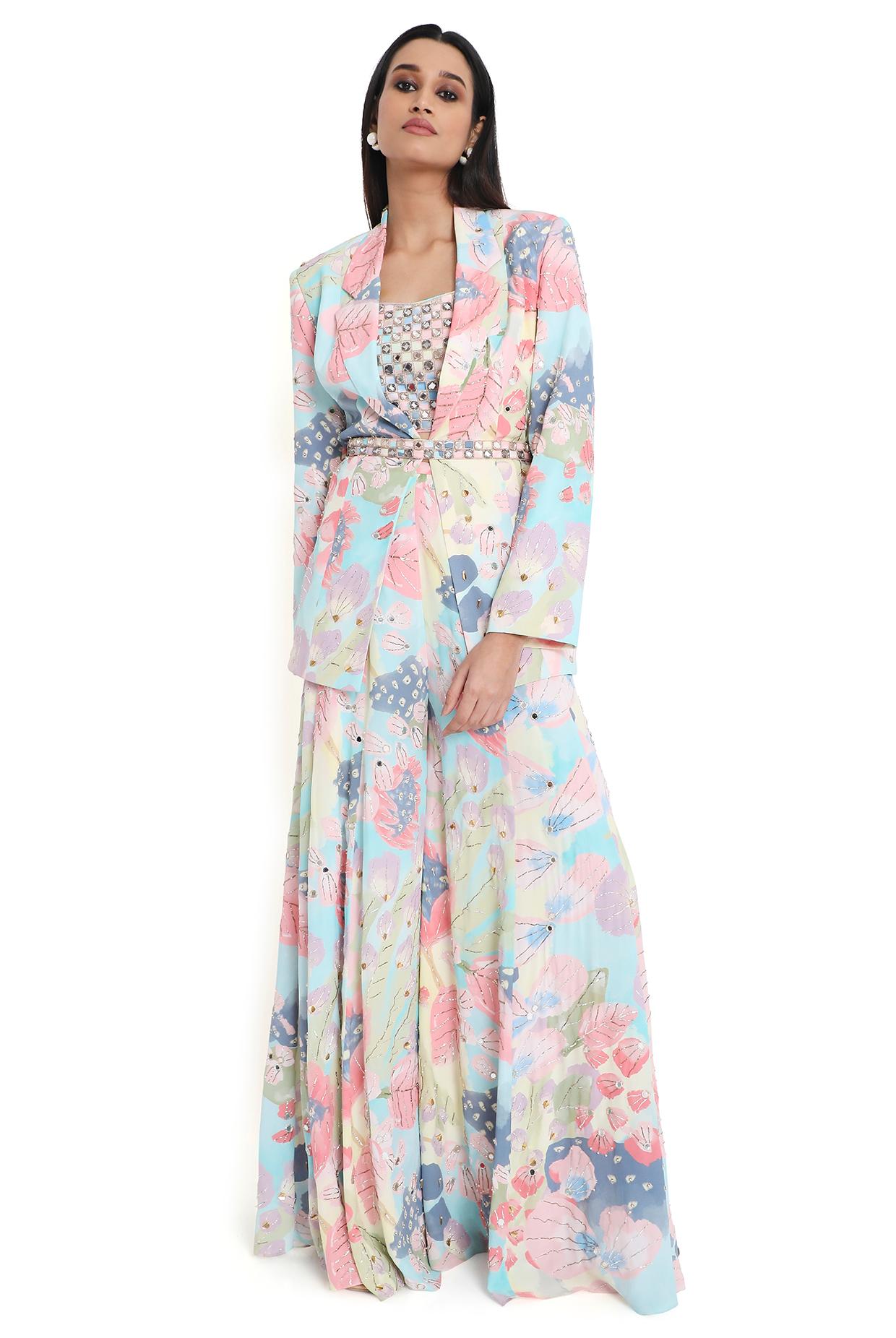 Fresia Euphoria Print Embroidered Blazer With Bustier And Sharara With Belt