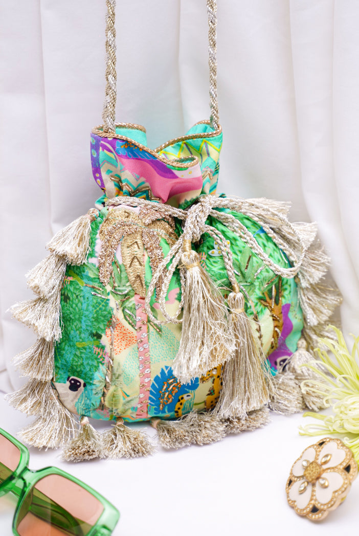 kuno small print crepe embroidered potli with tassels.