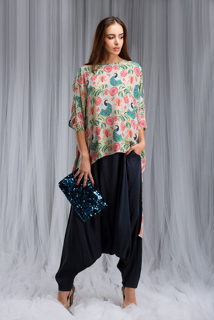Khaki Anaar aur Mor Print Crepe Cape Tunic with Tassels with Navy Silk Low Crotch Pants