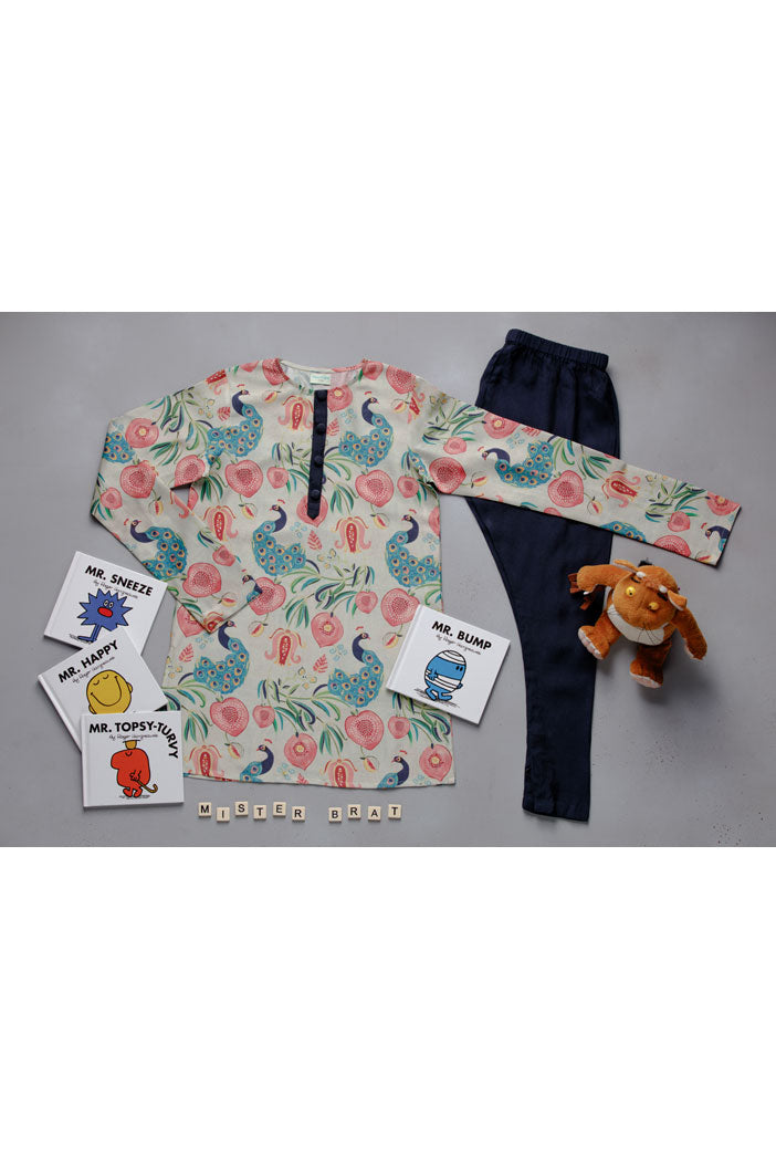 Khaki Anar Aur Mor Print Silkmul Kurta With Navy Placket And Navy Pyjama.
