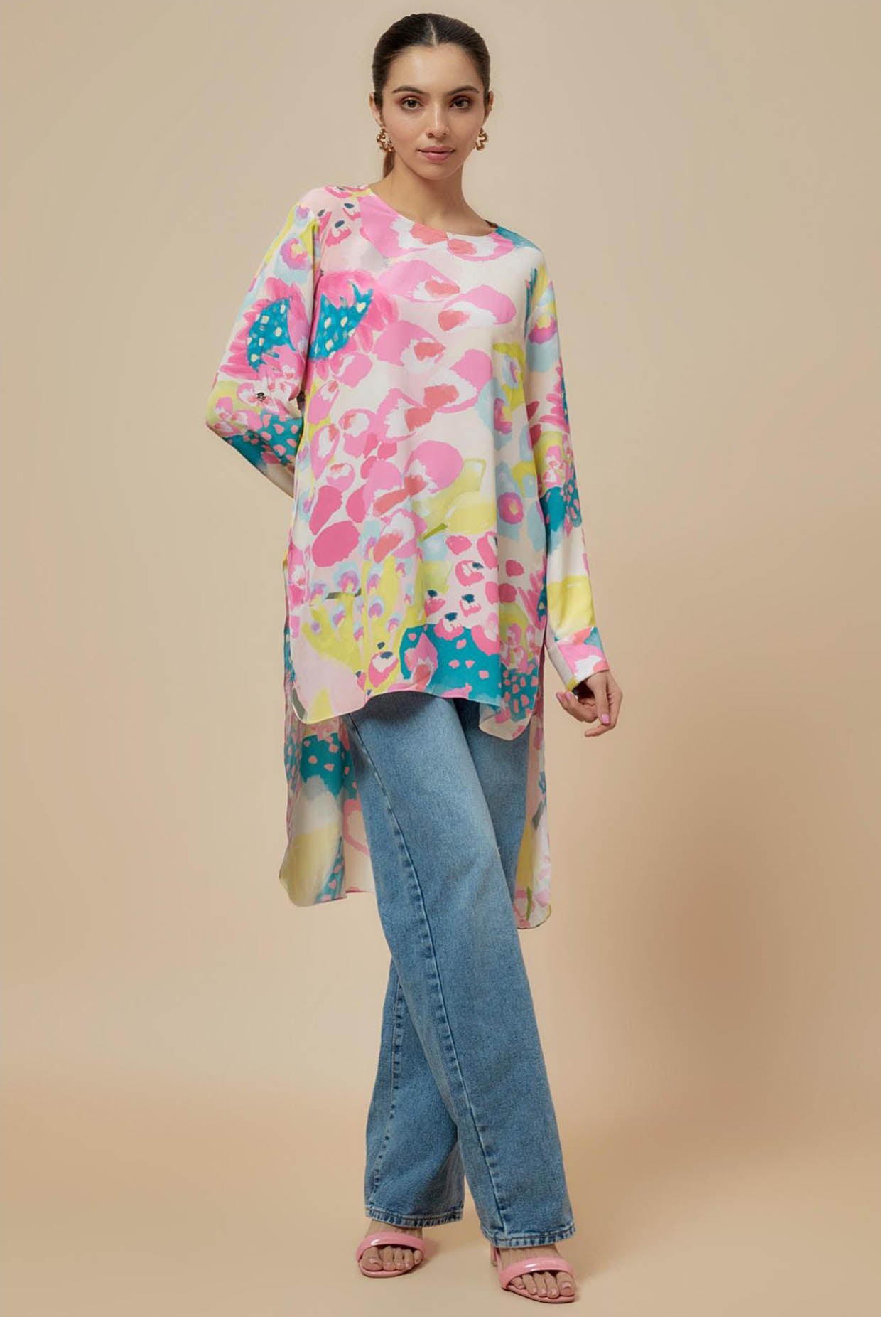 Lime Printed Crepe High Low Tunic With Rolled Up Sleeves