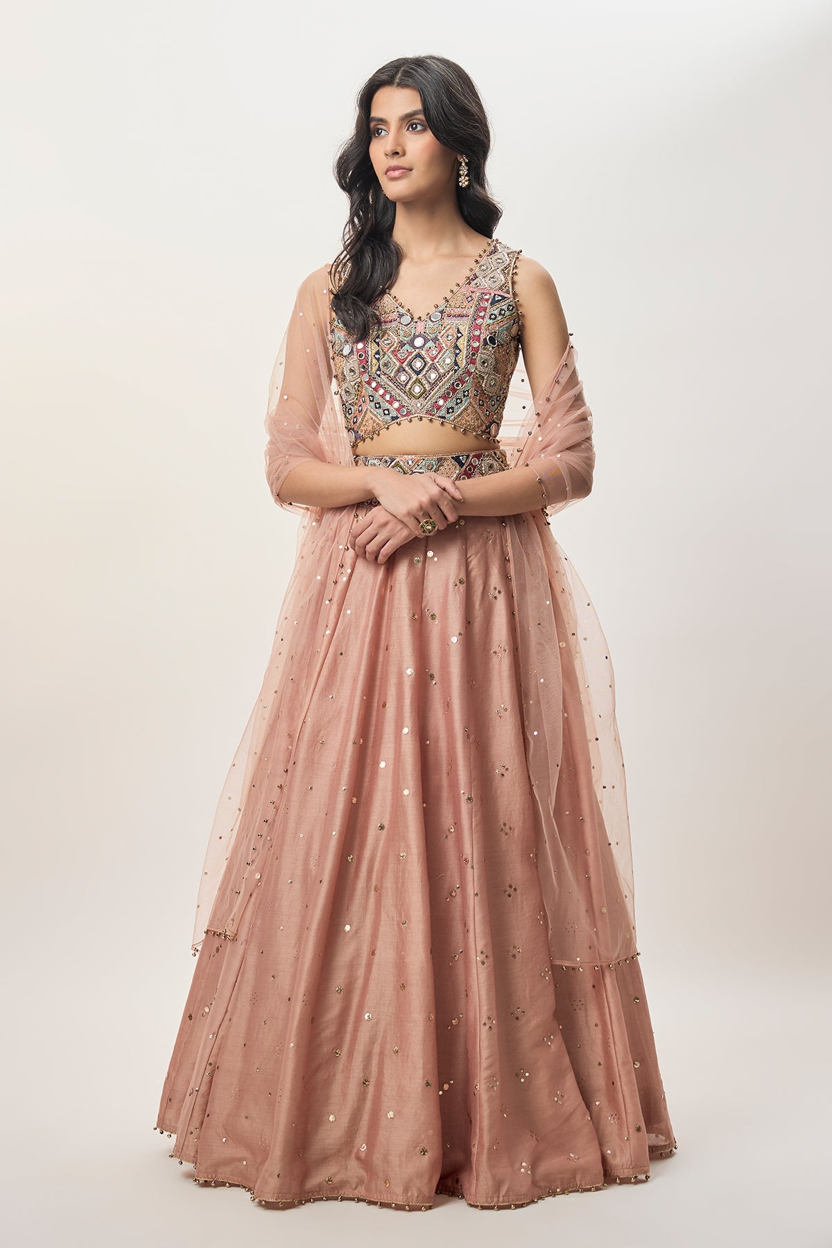 Mahnaz Peachy Pink Georgette Choli With Multicolour Embroidery And Mirror Work, Paired With A Silkmul Lehenga Featuring An Embroidered Waistband And An All-Over Mukaish Dot Pattern. Finished With A Sheer Mukaish Net Dupatta.