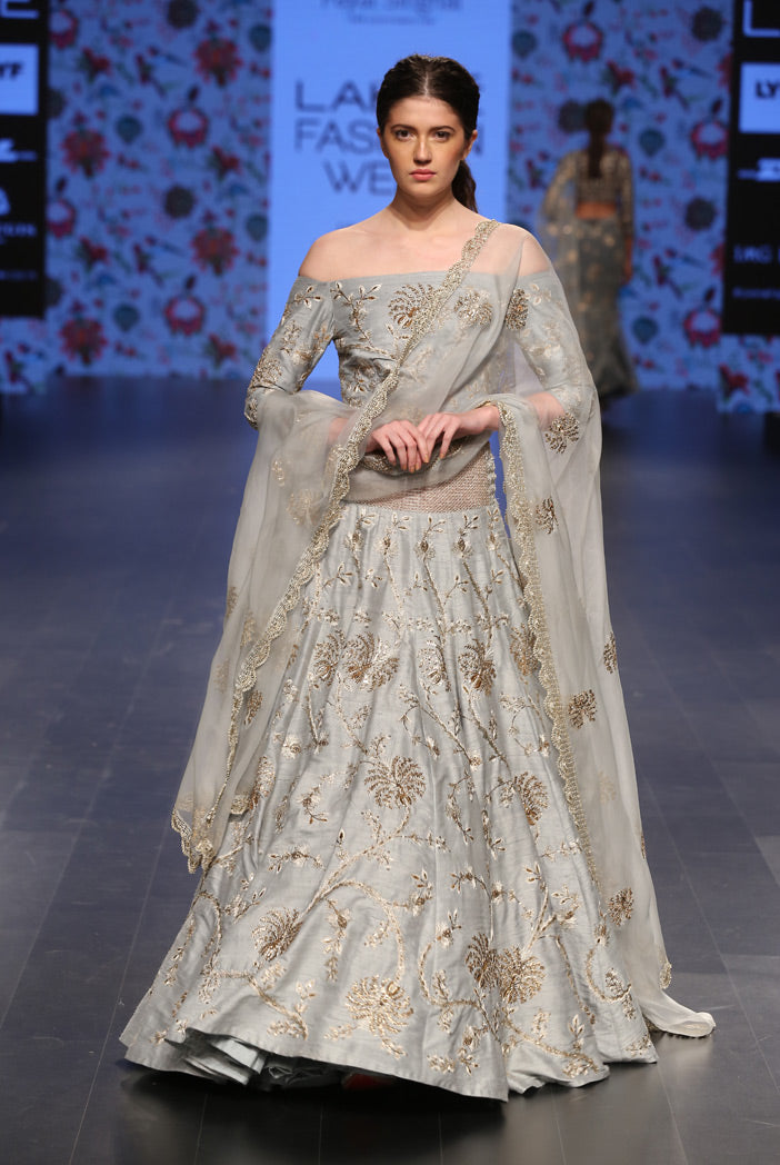 NurJahan Powder Blue Dupion Silk Off Shoulder Choli with Lehenga and Organza Dupatta