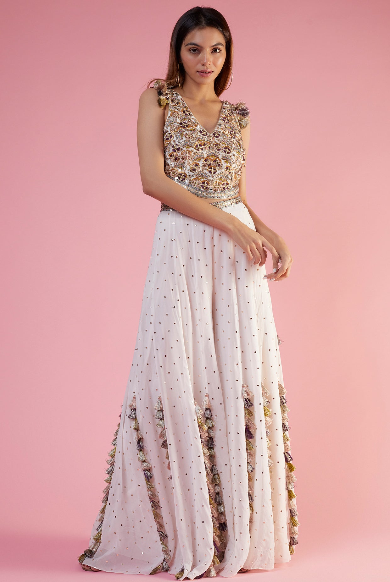 Off white georgette embroidered choli and mukaish georgette sharara.