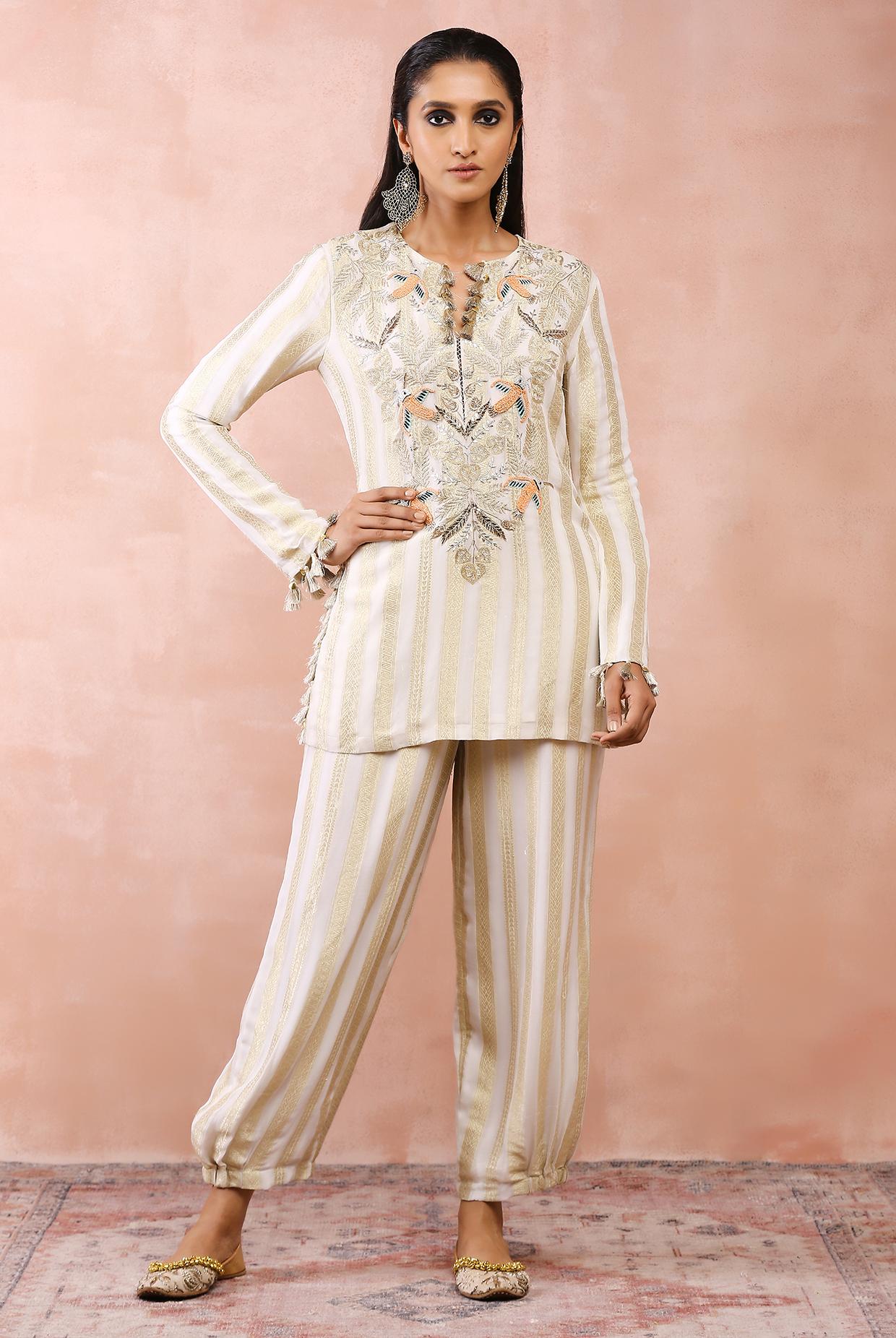 Off white gold stripe banarasi georgette embroidered kurta and pant.