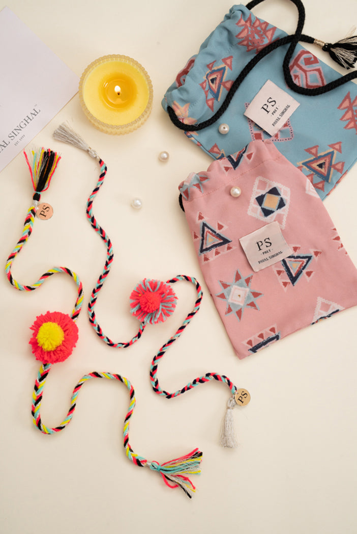This Raksha Bandhan, get a set of assorted Designer Rakhis from Payal Singhal's limited exclusive range and wow your brother(s). The Rakhis are made of colourful woolen threads and come with matching printed PS Signature Pouches.