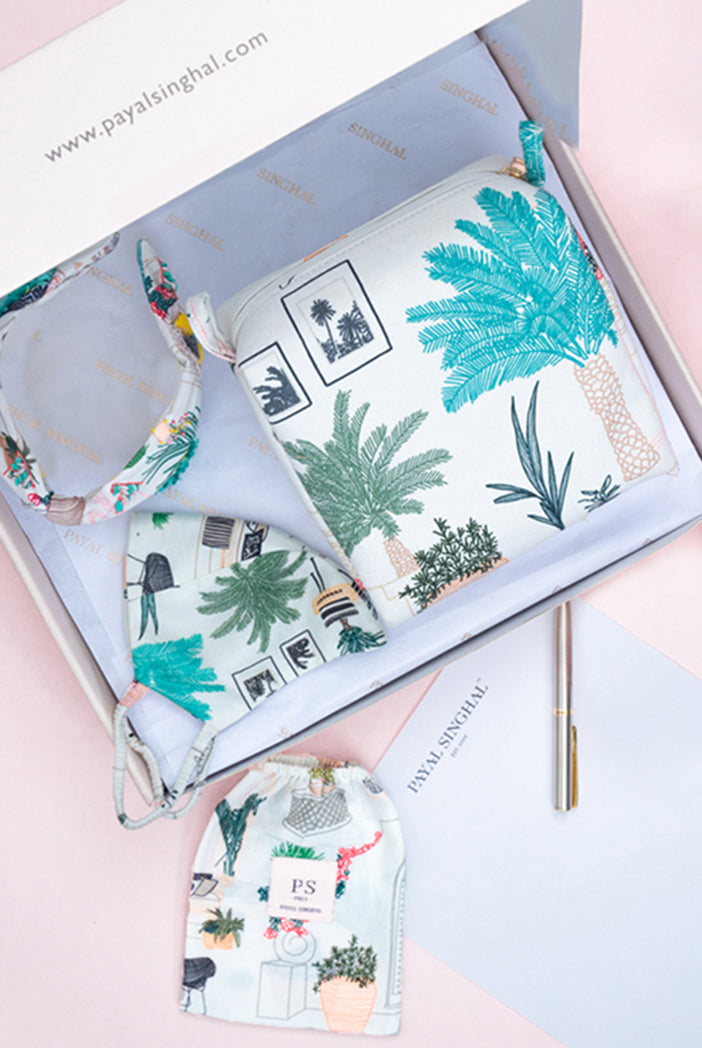Gift a perfect curation of products from Payal Singhal. This gift hamper consists of 1) Cafe Morocco print embroidered Headband 2) Cafe Morocco print 3 ply silkmul Mask 3) Matching printed Pouch 4) Cafe Morocco print small sized canvas Vanity Kit. The Mask is a reusable and washable three layered protective cloth mask with reversible prints so that you can wear it both ways and match it with multiple looks. Top and bottom layer made of 75% Cotton & 25% Silk with a layer of 100% cotton in the middle for better protection and breathability. Sits comfortably on the ear with printed ear loops, which gives it an overall premium look. Ideal for all day use. Comes along with a matching printed Pouch that fits elegantly in your purse or bag and a matching printed Headband to accentuate your look even further. Please Note: Print placement may vary slightly as compared to images shown. These are not medical grade masks. The Gift Hamper is placed in an exclusive Payal Singhal Gift Box.