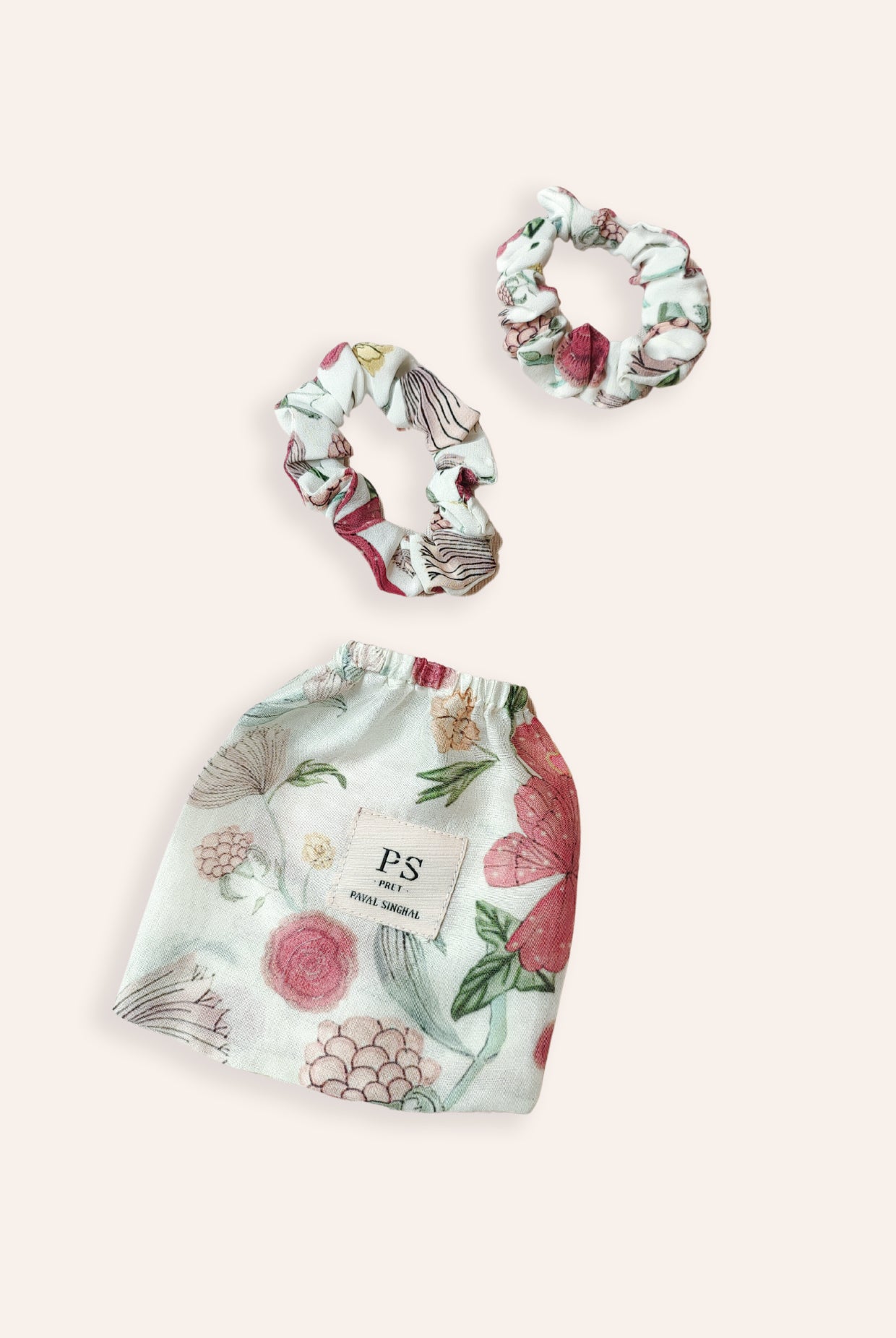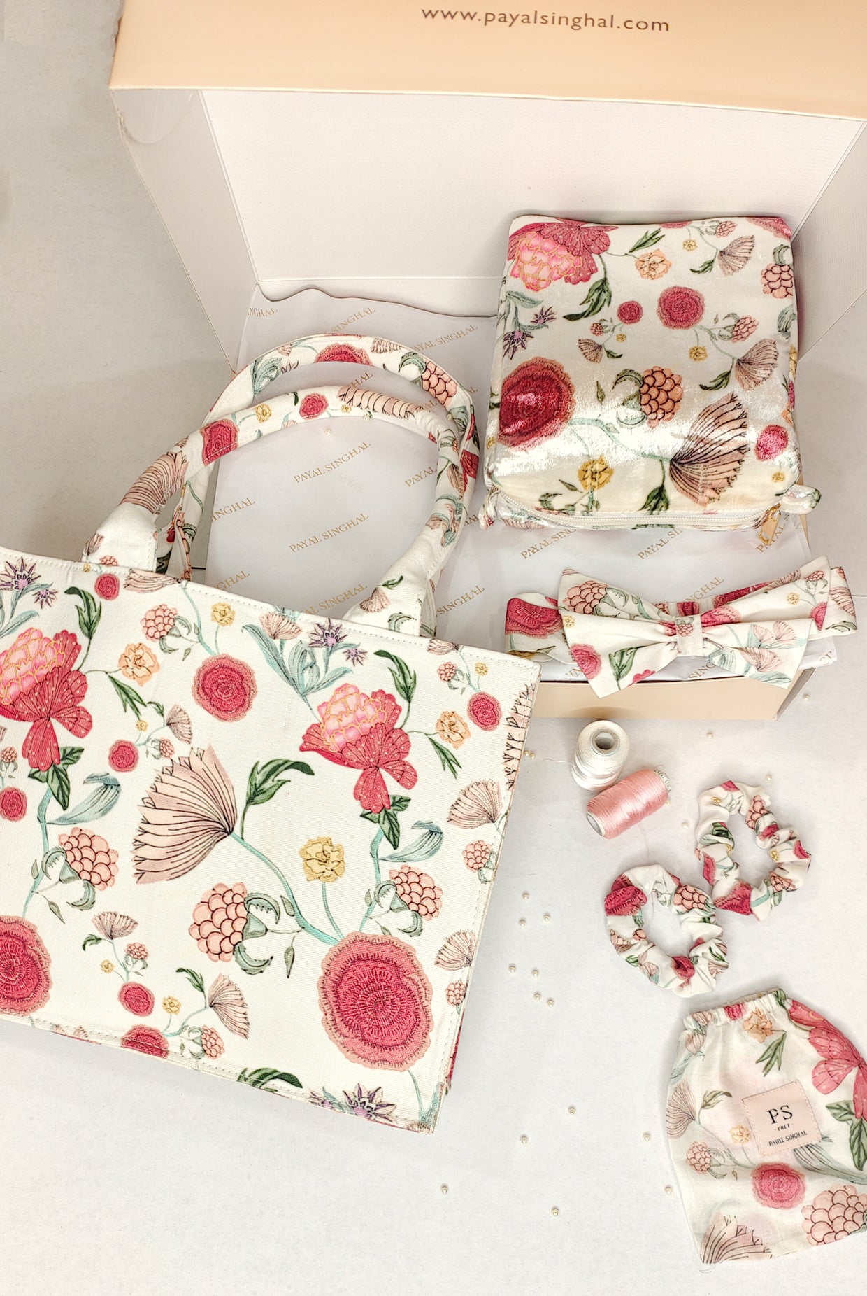 Gift a perfect curation of products from PS Kids by Payal Singhal for Girls. This gift hamper consists of 1) White gulbagh canvas small tote bag 2) 2 x White gulbagh print scrunchies with silkmul pouch 4) White gulbagh print hairband 5) White gulbagh velvet vanity kit