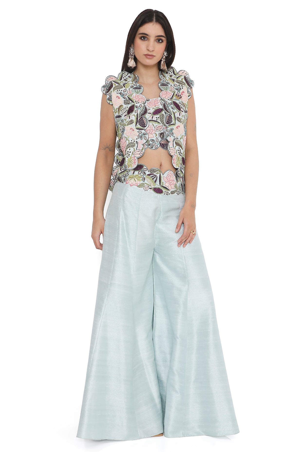 Powder blue embroidered dupion silk choli and embroidered scalloped jacket with embroidered sharara.