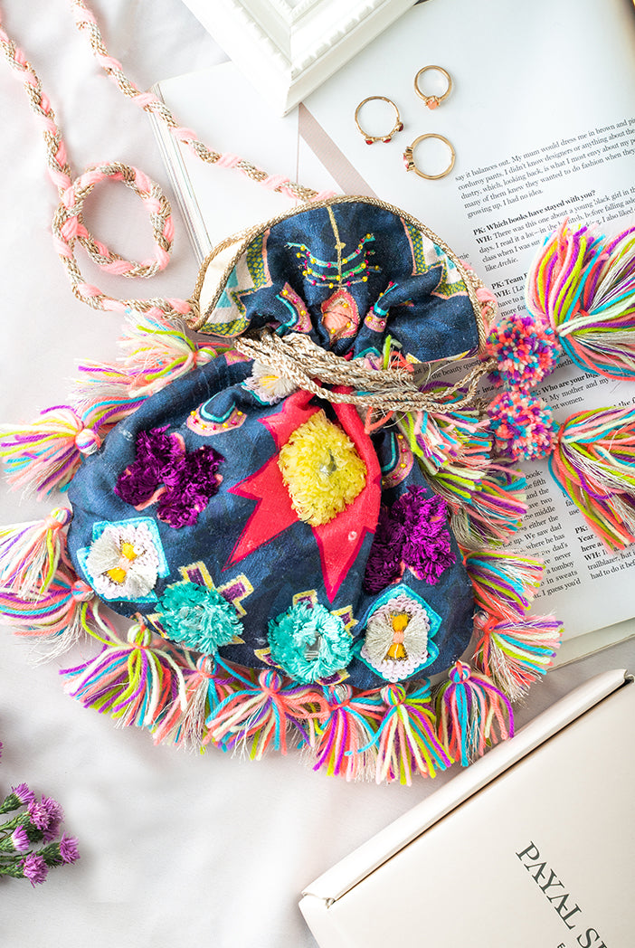 Purple Ikat Star print Sling Potli Bag made up of Dupion Silk fabric. The Potli Bag has been beautifully crafted by PS Signature Prints and Highlighted with Embroidery to accentuate your Festive Look. Please Note: Print placement may vary slightly as compared to images shown.