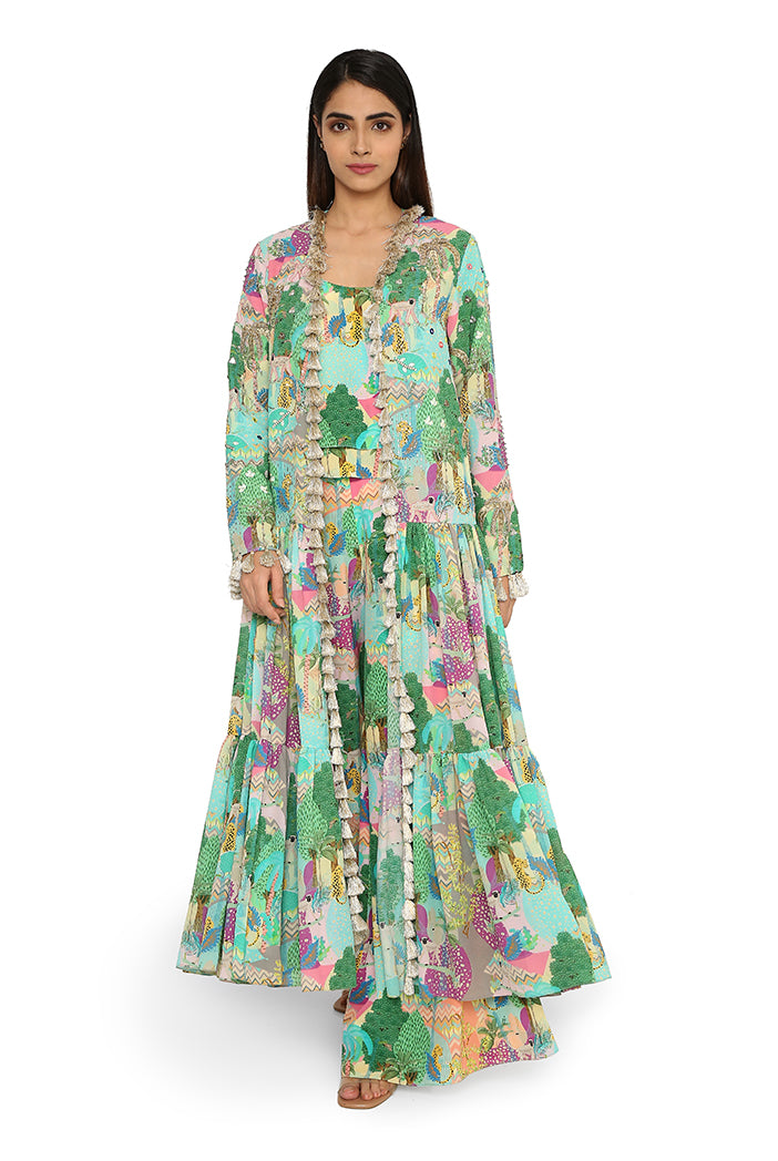 Grey kuno print georgette embroidered frill jacket with peach printed crepe two layer top and palazzo.