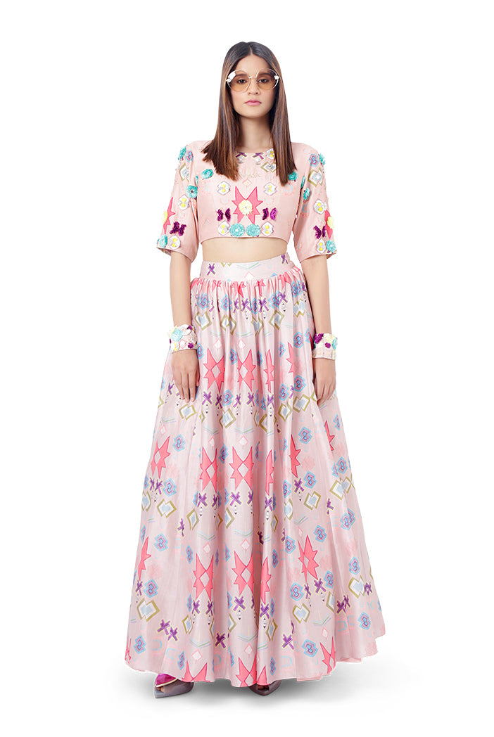 Pink Ikat Star print silkmul embroidered choli with silkmul lehenga and net embroidered dupatta with printed piping and colourful tassels.
