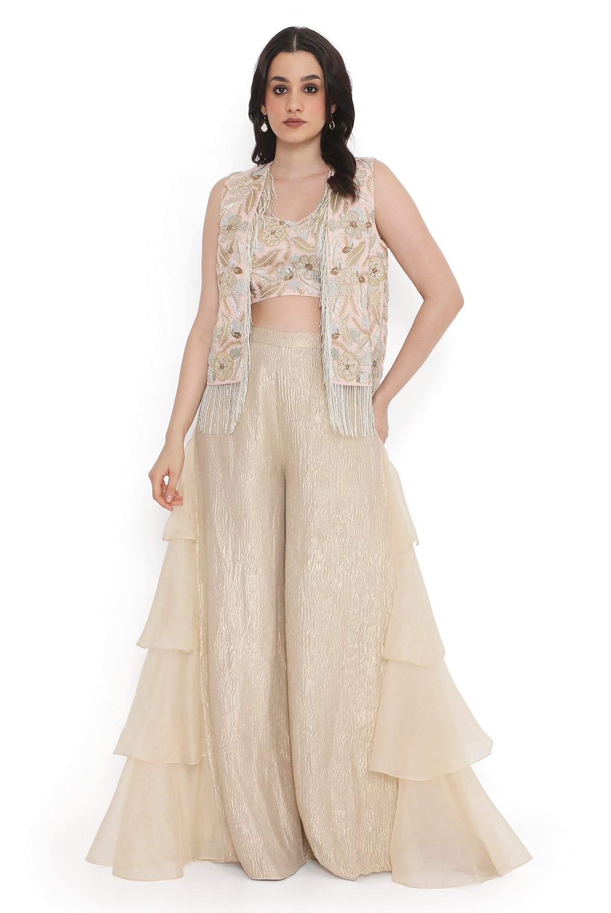 Rose pink georgette embroidered jacket with hanging tassels and embroidered bustier with organza side ruffled tissue pant.