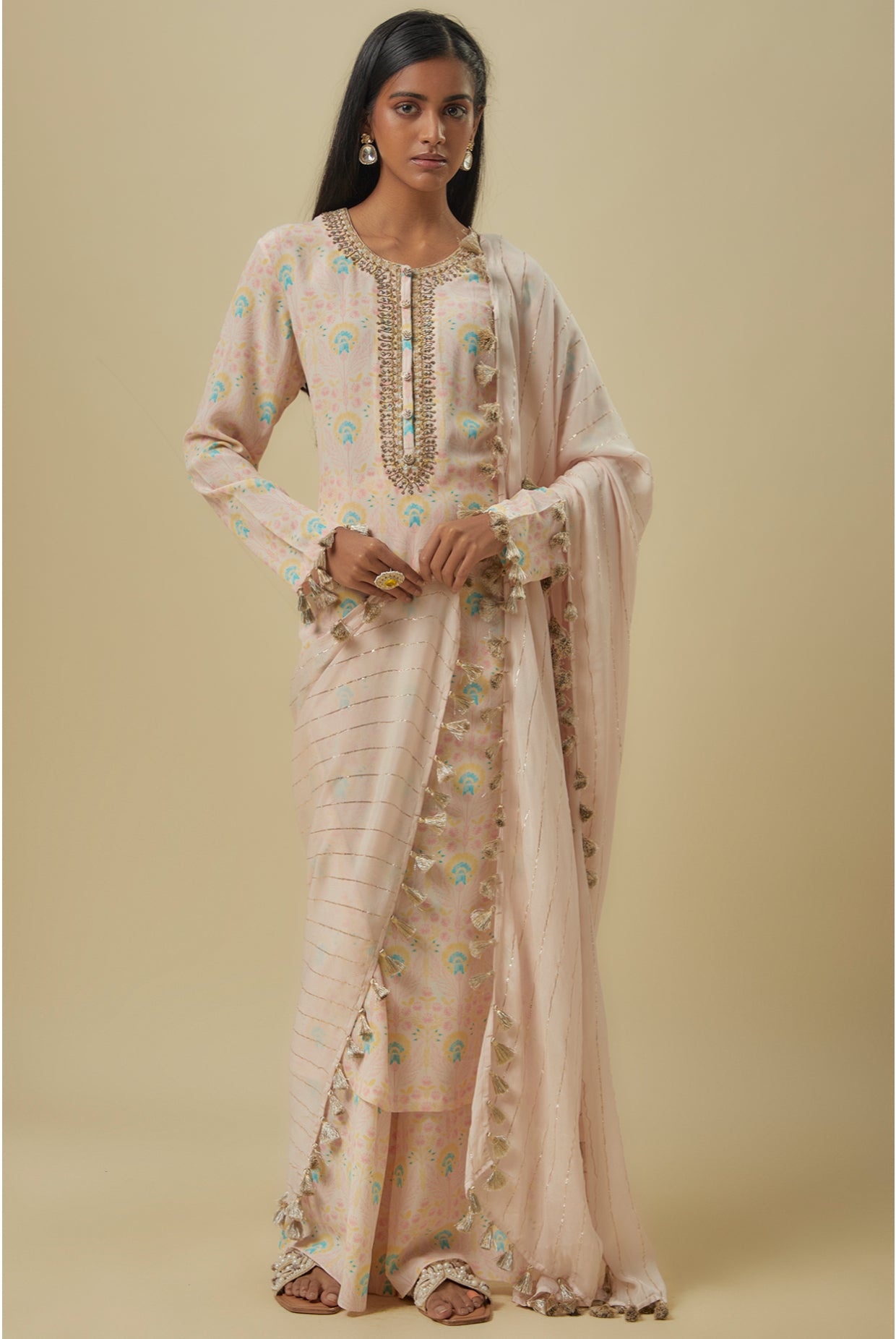 Stone Colour Flower Butta Crepe Fabric Embroidered Yoke Kurta With Palazzo And Line Chiffon Dupatta.