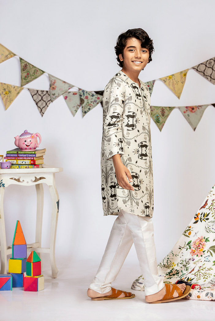 Stone Khargosh Print Silk Kurta with Off White Cotton Silk churidar