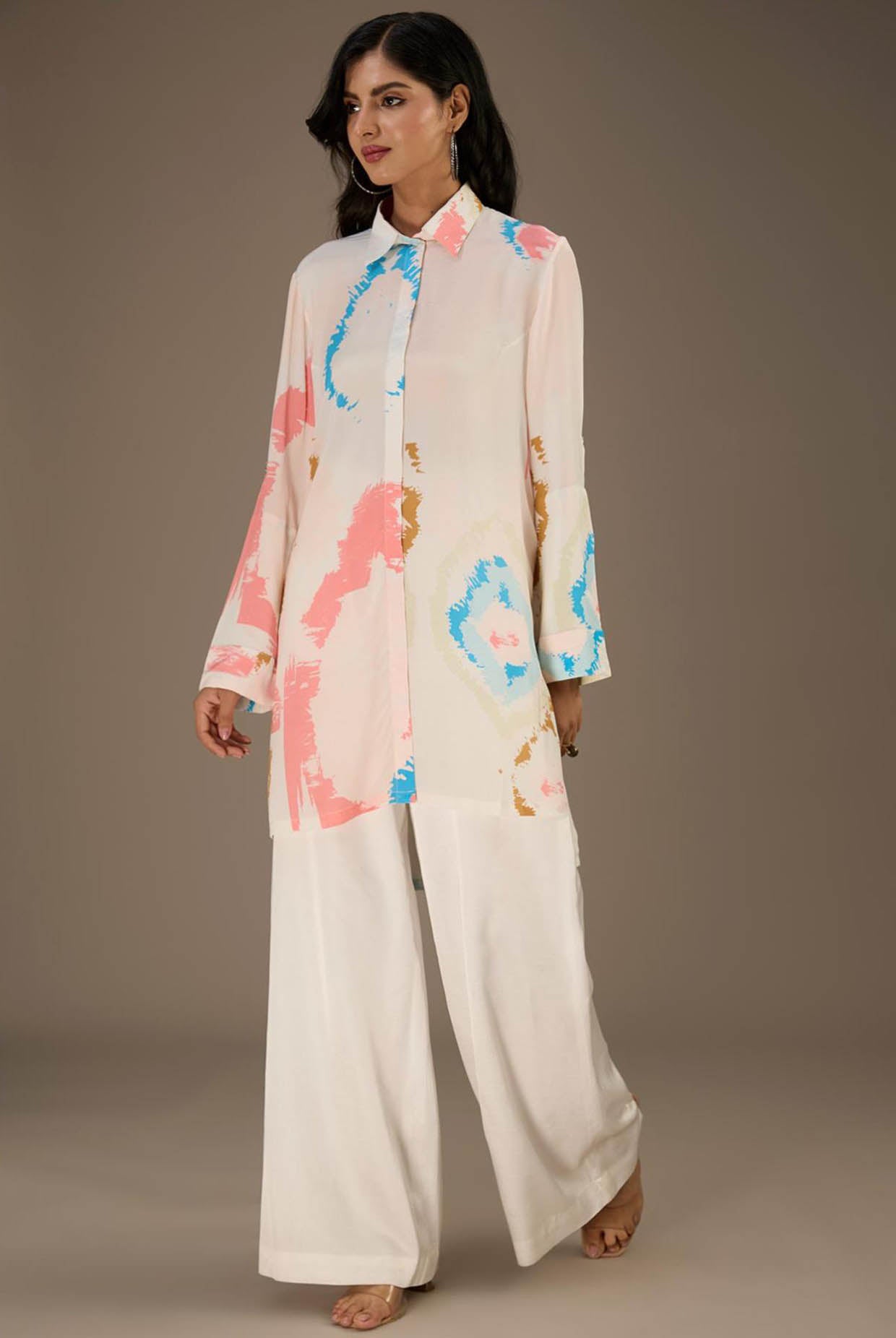 White ikat splash print crepe roll-up sleeve shirt dress.