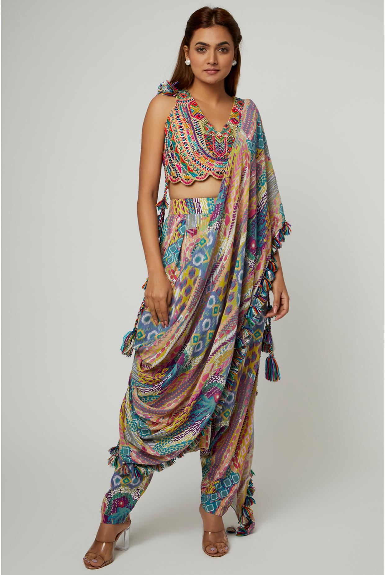 1 Choli, 1 Low-Crotch Pant With Attached Drape