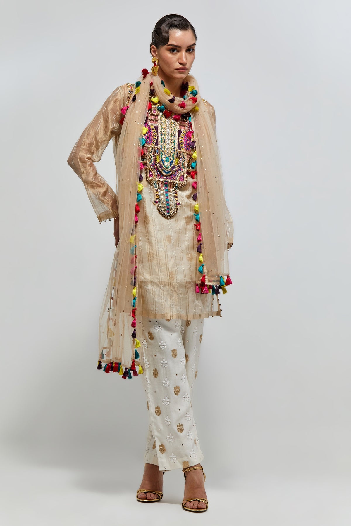 Zarif gold stripe tissue embroidered yoke kurta paired with an off-white Banarasi buti chikan bustier and palazzo. Finished with a mukaish net dupatta.